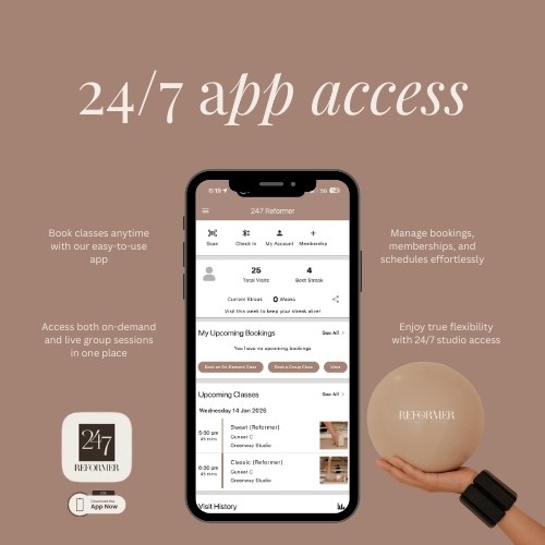 We are a luxurious hybrid Pilates studio offering both live instructed group classes and over 800 on-demand classes available anytime in studio.