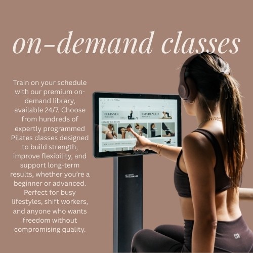 We are a luxurious hybrid pilates studio offering both Instructor-led group classes and over 800 on-demand classes available anytime in studio.